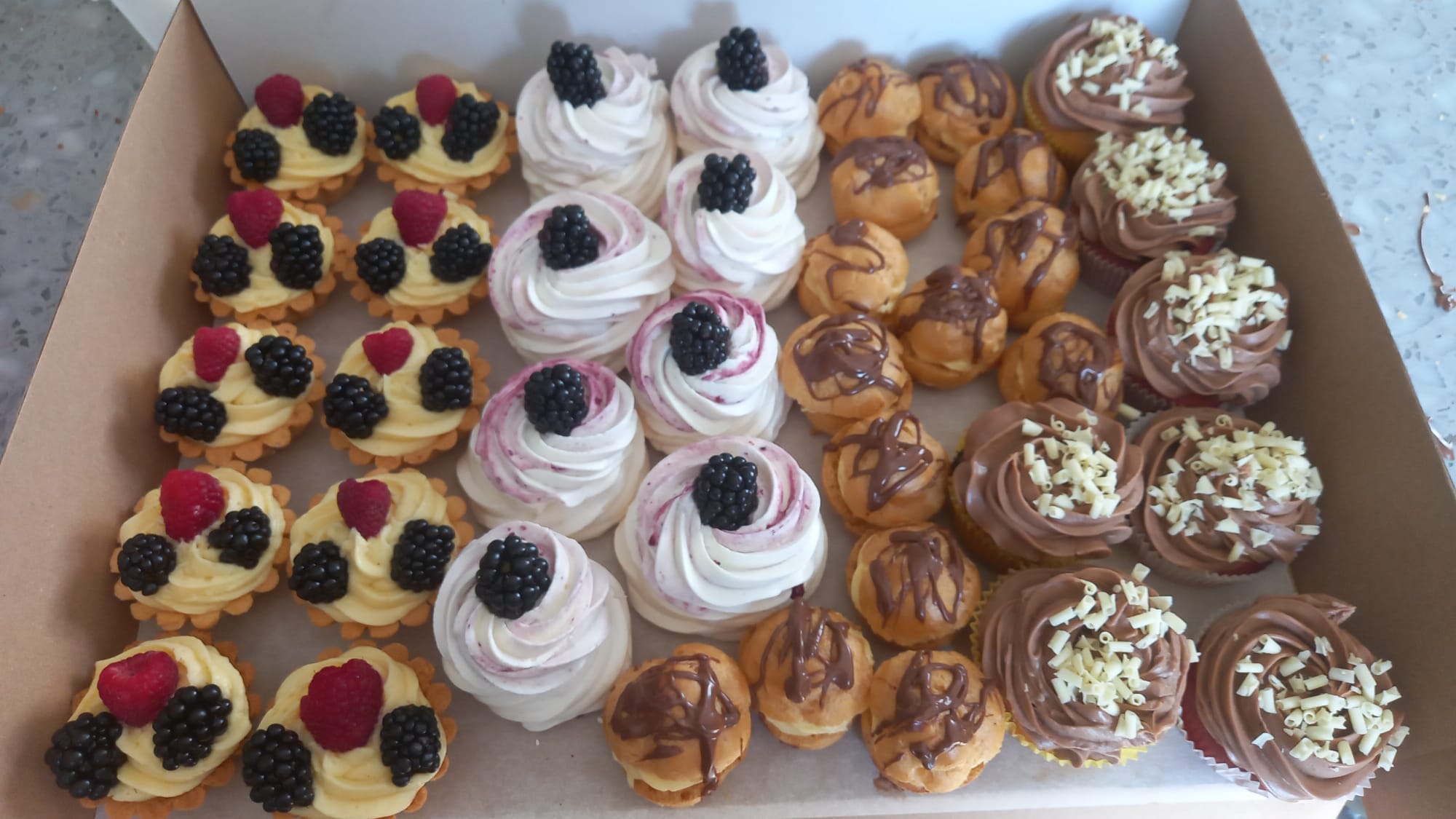 Fiecare cutie de mini prăjituri aduce o diversitate de arome pentru a vă satisface pofta. De la vanilie delicată la ciocolată intensă și de la fructe proaspete la nuci crocante, veți descoperi o varietate de delicii în fiecare mini prăjitură.
